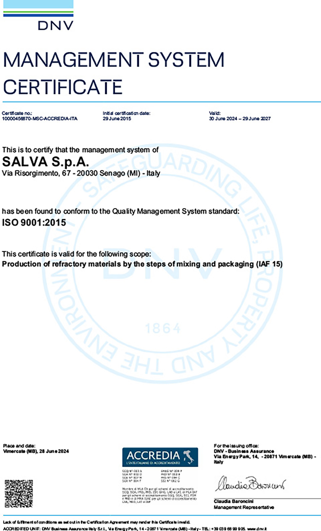 SALVA S.p.A. has obtained compliance with the requirements of the standard for the Quality Management System relating to the production of refractory materials through the mixing phases.